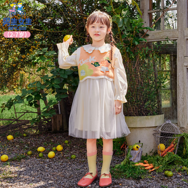 男生女生童装女童连衣裙套装2024新款儿童纱裙春秋款娃娃领公主裙 米色 105cm