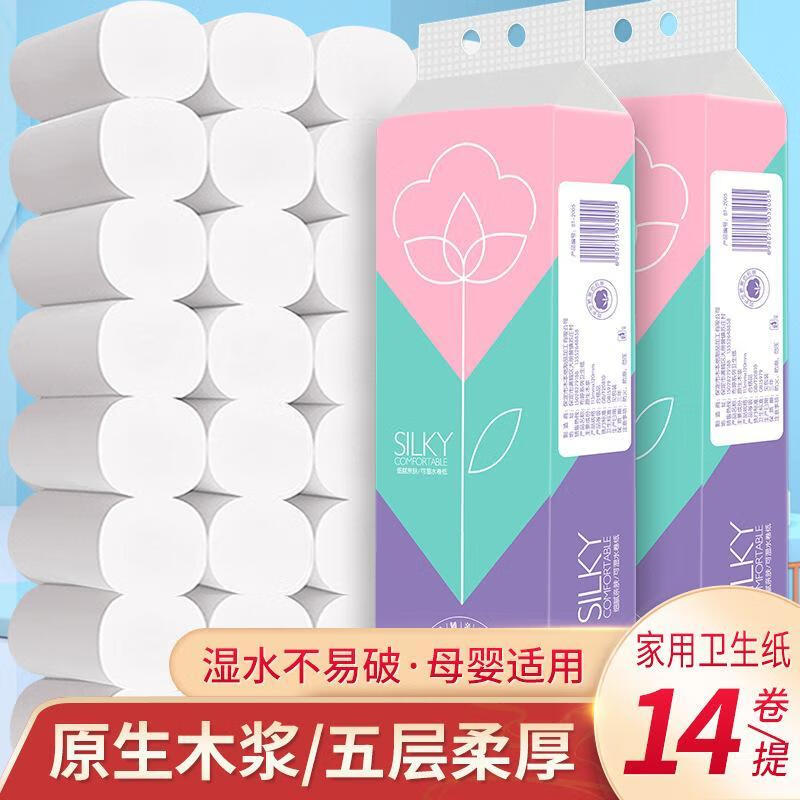 卫生纸木浆层14卷纸巾柔肤印花无心卷纸家用厕纸 5层 25g/卷 14卷 一提