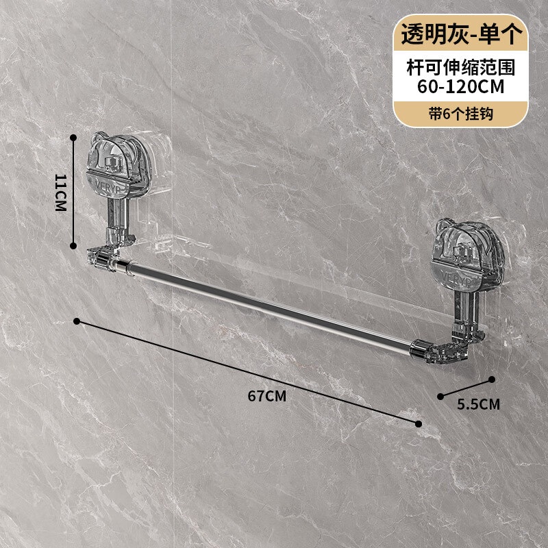 小熊转角伸缩吸盘毛巾架免打孔浴室毛巾杆卫生间置物架单杆挂钩 小熊吸盘伸缩毛巾架【透明灰】