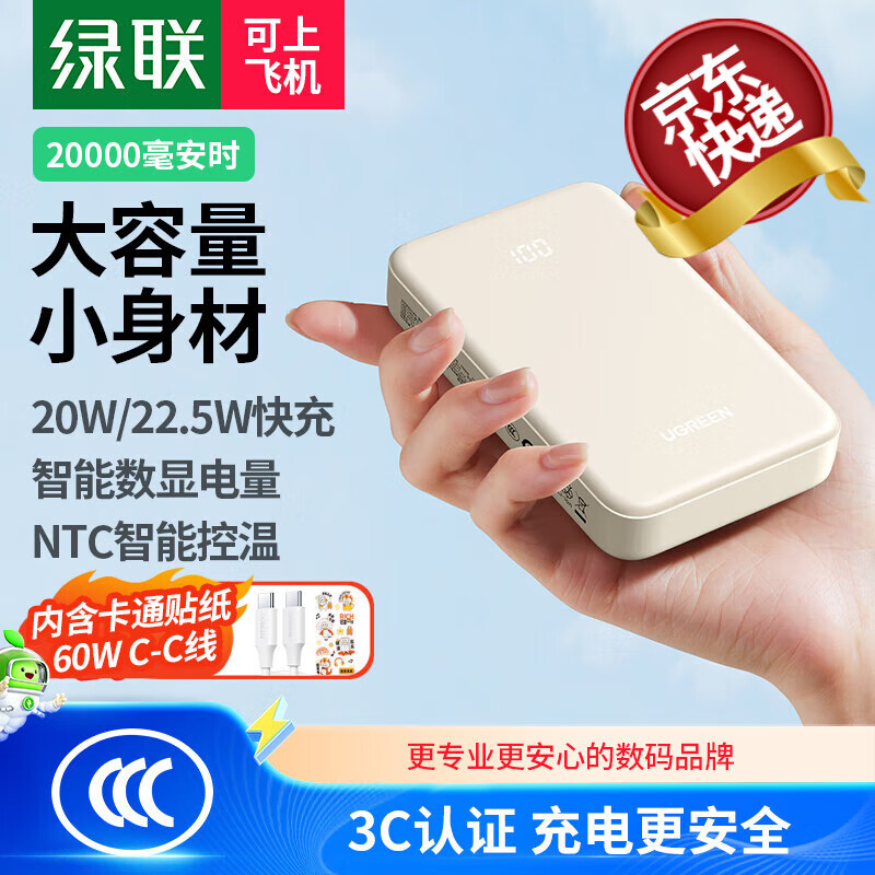 绿联[3C认证]充电宝20000毫安时 22.5W超级快充兼容苹果20W可上飞机大容量移动电源 适用华为小米手机