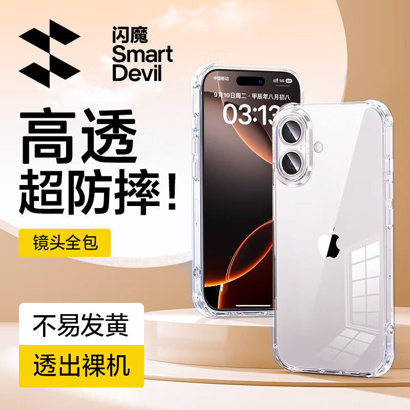 闪魔(SmartDevil) 适用苹果16手机壳 iPhone16气囊防摔保护套超薄镜头全包透明软壳抗黄防磨防摔男女同款